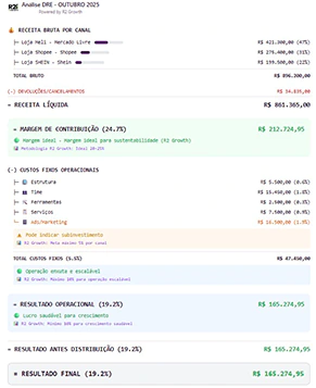Clareza (DRE, margem por SKU e vazamentos) costuma aparecer nas primeiras semanas. Melhora consistente de operação e margem depende de execução, estoque e canal, por isso o trabalho é guiado por ciclos de 4 a 12 semanas.